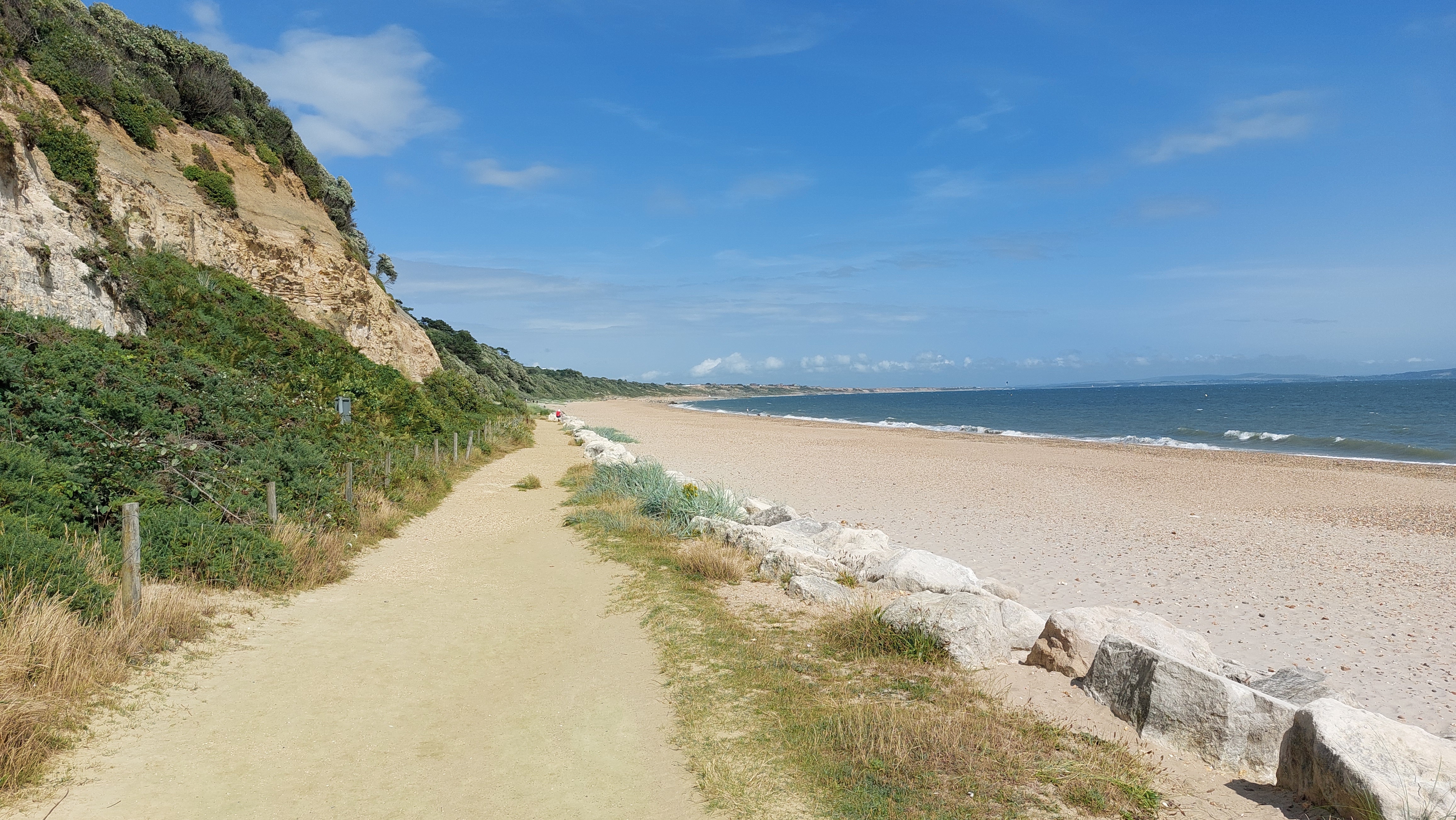 Just beyond Barton, there has been a landslip which bars progress along the beach. It is hence necessary to follow an inland diversion around the Naish Holiday Park returning to the beach down Chewton Bunny, a pleasant wooded valley. From there, there is a rough track at the head of the beach, passing Highcliffe Castle and Steamer Point eventually becoming a sea wall/esplanade near Mudeford Quay.